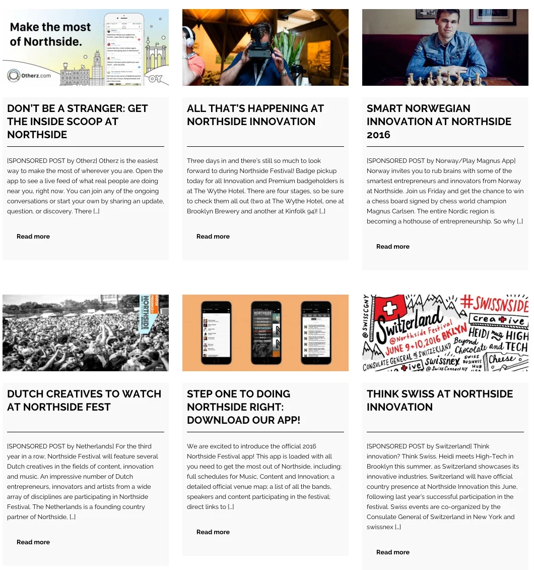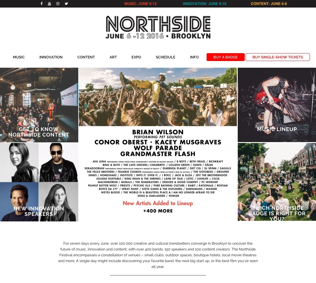 I acted as Northside Festival’s website’s manager. Zealot media’s subsidiary, Northside, worked closely with me to launch a rebranded site. I worked with an international team of developers, designers, social managers to create a spankin’ new site to drive ticket sales.